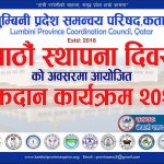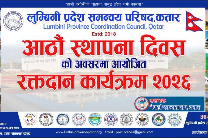 - कतारमा लुम्बिनी प्रदेश समन्वय परिषद्को आठौं स्थापना दिवसको अवसरमा “रक्तदान” कार्यक्रमदोहा, कतार – १३ जनवरी २०२६ । लुम्बिनी प्रदेश समन्वय परिषद् कतारले आफ्नो आठौं स्थापना दिवसको अवसरमा विशेष रक्तदान कार्यक्रम आयोजना गर्ने भएको छ । मानवीय सेवालाई प्राथमिकतामा राख्दै परिषद् तथा