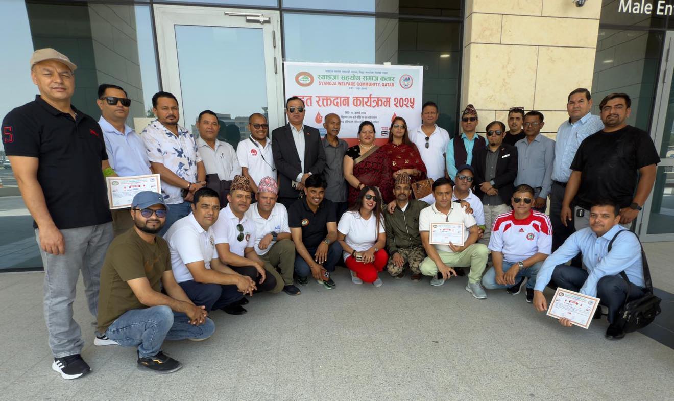 दोहा, कतार — “स्याङ्जा सहयोग समाजको चाहना, विशुद्ध सामाजिक सेवाको भावना” भन्ने नाराका साथ स्याङ्जा सहयोग समाज कतारको आयोजनामा “बृहत् रक्तदान कार्यक्रम २०२५” सफलतापूर्वक सम्पन्न भएको छ। हमाद अस्पतालको Blood Donors Center मा आयोजित कार्यक्रममा कुल ७६ जनाले रक्तदान गरेका छन्।