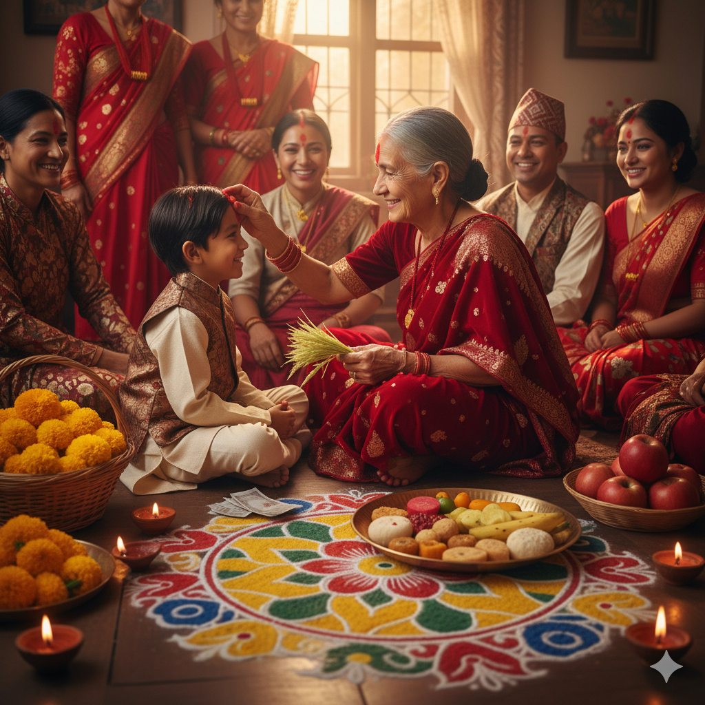 तपाईंले सेयर गर्नुभएको तस्बिरमा देखिएको दृश्य दशैंको मुख्य अंग हो – टिका, जमरा र आशीर्वादको। यसमा हातहरूमा रातो टिका (अबीर, चामल, दही र जमराको मिश्रणले बनेको), पहेँलो फूलहरू (मारिगोल्ड), हरियो स्याउ, पैसा (दक्षिणा) र अन्य पूजाका सामग्रीहरू छन्। यो दृश्य परिवारका ठूलाबडाले स-साना सदस्यहरूलाई आशीर्वाद दिने परम्परालाई प्रतिबिम्बित गर्दछ। घरका मुख्य खम्बा (सरस्वती खम्बा) को पूजा गरेपछि उमेरक्रमअनुसार टिका लगाइन्छ। यदि ठूलाबडा नभएमा जीवनसाथी वा दाजुभाइबाट नै टिका लगाइन्छ। मामाघरमा टिका लगाउँदा दक्षिणा दिने र घरमा लगाउँदा पनि शुभकामना सहित उपहार दिने चलन छ। यो परम्पराले देवताहरूको राक्षसहरूमाथि विजय, सत्यको झूटमाथि जित र मानवताको अमानवतामाथि विजयको प्रतीक गर्दछ।