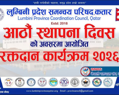 थप →दोहा, कतार – १३ जनवरी २०२६ । लुम्बिनी प्रदेश समन्वय परिषद् कतारले आफ्नो आठौं स्थापना दिवसको अवसरमा विशेष रक्तदान कार्यक्रम आयोजना गर्ने भएको छ । मानवीय सेवालाई प्राथमिकतामा राख्दै परिषद् तथा अन्तर्गतका जिल्ला संस्थाहरूको संयुक्त आयोजनामा र नेपाली रक्तदाता संघ कतारको समन्वयमा