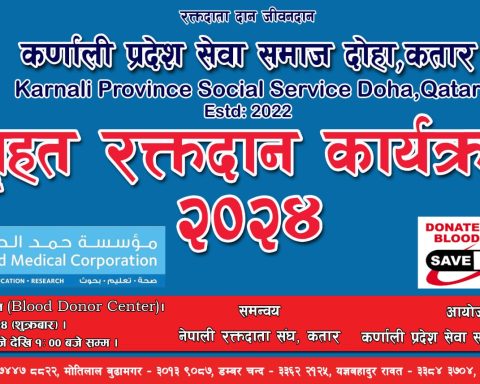 all →दोहा – दोहा : कर्णाली प्रदेश सेवा समाज दोहा कतारको आयोजना र नेपाली रक्तदाता संघ,कतारको समन्वयमा ९ फेब्रुअरी २०२ ४ शुक्रबारका दिन “बृहत रक्तदान कार्यक्रम हुने भएको छ । समाजका अध्यक्ष मोतीलाल बुढामगरका अनुसार हमाद (Blood Donar Center)